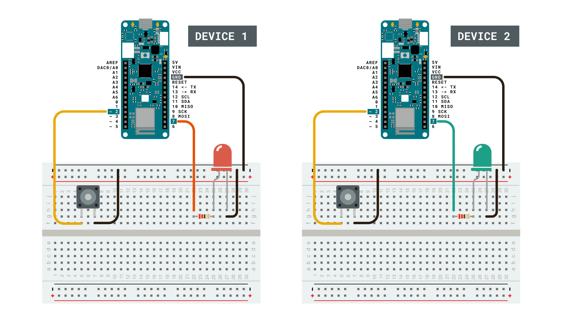 - The button on Device_2 will control the LED on Device_1.