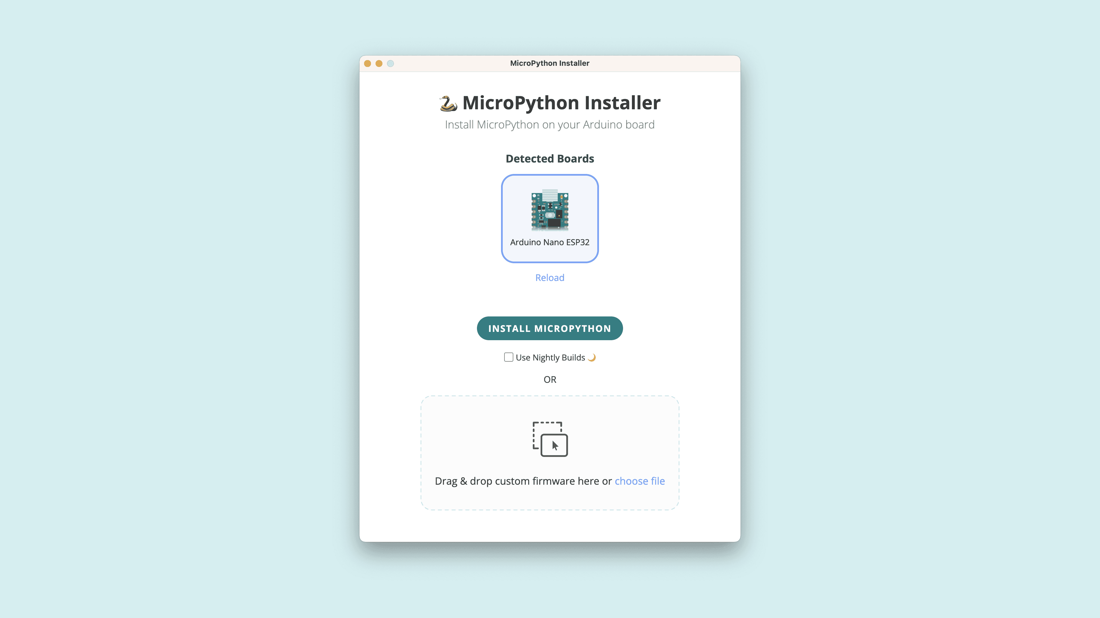 We have developed a tool for installing the MicroPython firmware to your Arduino boards with a simple click. This tool lets you plug in the board, select it from a menu, and automatically flash the latest firmware, or a custom one of your choice to the board.