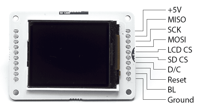 The screen can be configured for use in two ways. One is to use an Arduino's hardware SPI interface. The other is to declare all the pins manually. There is no difference in the functionality of the screen between the two methods, but using hardware SPI is significantly faster when drawing.