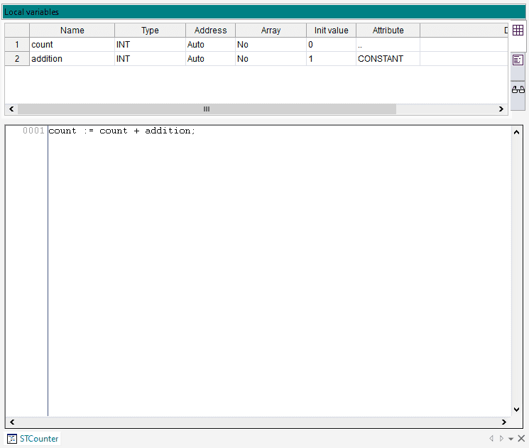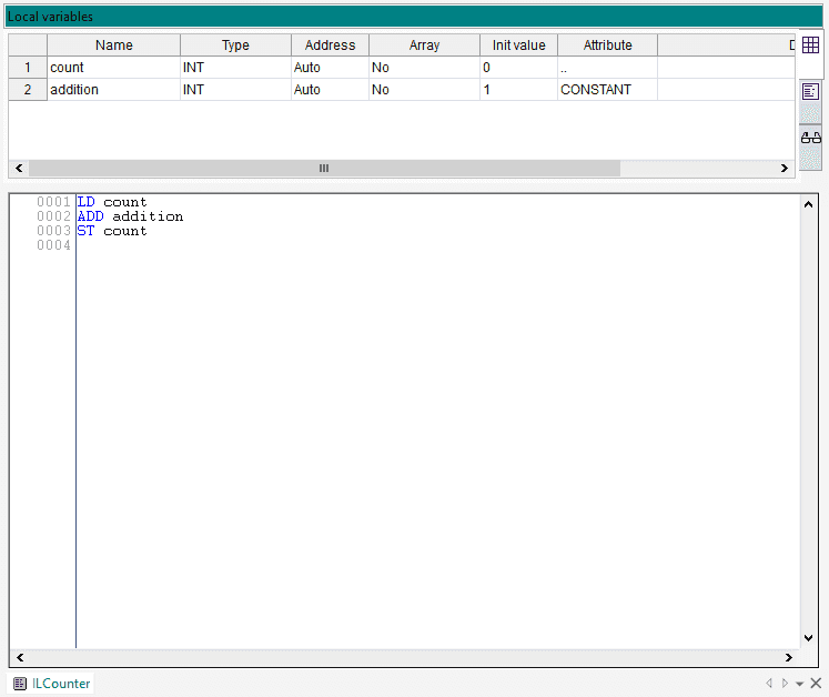 The counter program should look like the following picture. Note the action inside the "count" Step: you can see a small "counter" text which is the action's name of the program done in Structured Text which code is the same as shown in the Structured Text section.