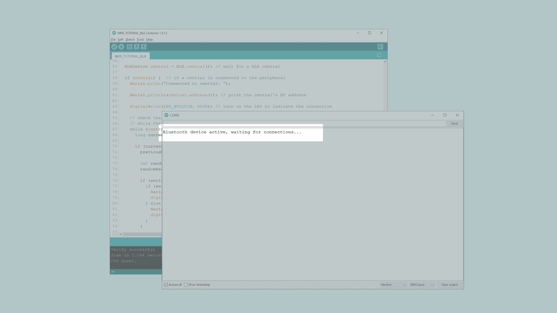 Once we are finished with the coding, we can upload the sketch to the board. When it has been successfully uploaded, open the Serial Monitor. In the Serial Monitor, the text " Bluetooth® device active, waiting for connections..." will appear.
