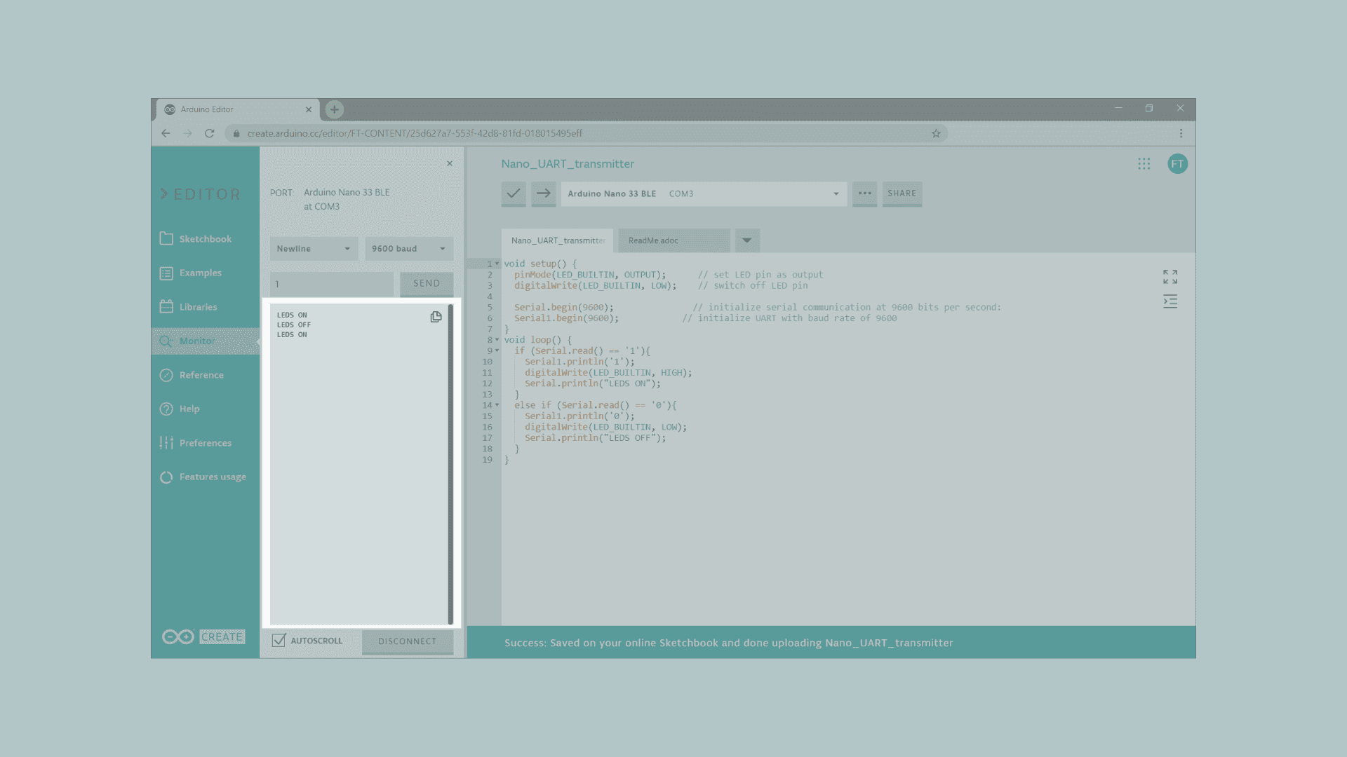 5 Serial.begin(9600); // initialize serial communication at 9600 bits per second:6 Serial1.begin(9600); // initialize UART with baud rate of 96007}8void loop() {9 if (Serial.read() == '1'){10 Serial1.println('1');11 digitalWrite(LED_BUILTIN, HIGH);12 Serial.println("LEDS ON");13 }14 else if (Serial.read() == '0'){15 Serial1.println('0');16 digitalWrite(LED_BUILTIN, LOW);17 Serial.print("LEDS OFF");18 }19}Testing It Out