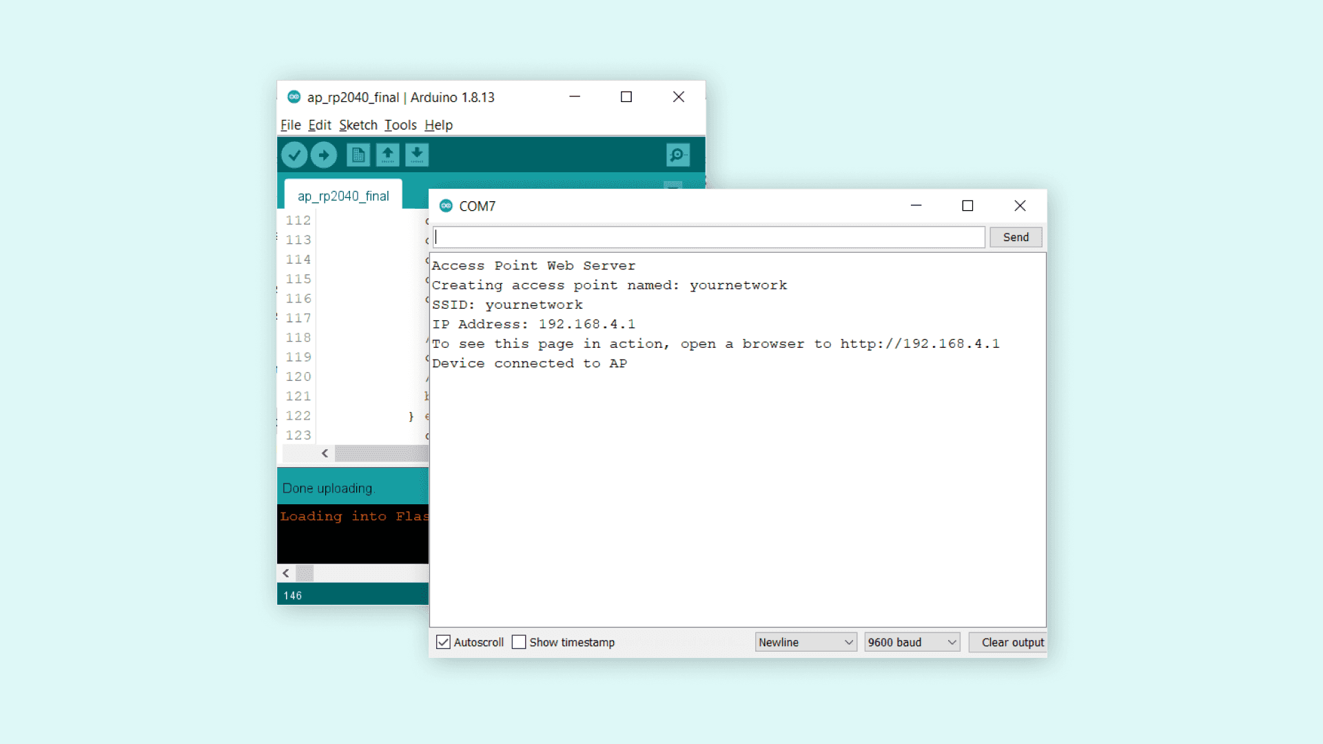 When we open it, it will attempt to create an access point, and if it is successful, it will print out the boards IP address in the Serial Monitor.